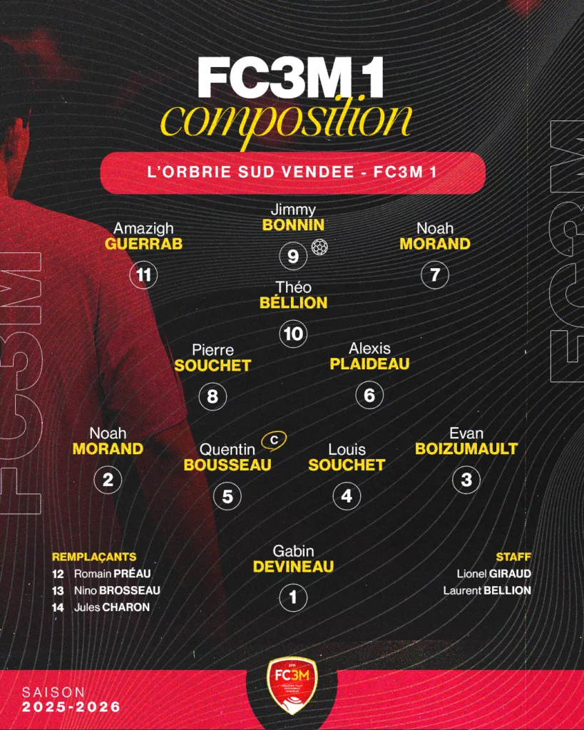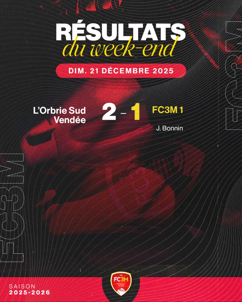 Dernier match 2025 : une défaite qui appelle à revenir plus fort ! L’équipe première perd 2-1 face à L’Orbrie Sud Vendée SENIORS L’Orbrie Sud Vendée – FC3M 1 (2-1) Défaite 2–1 face à L’Orbrie Sud Vendée. RÉSULTATS CLASSEMENT La composition de départ actuchampionnatfc3mrésultatsrésuméseniors