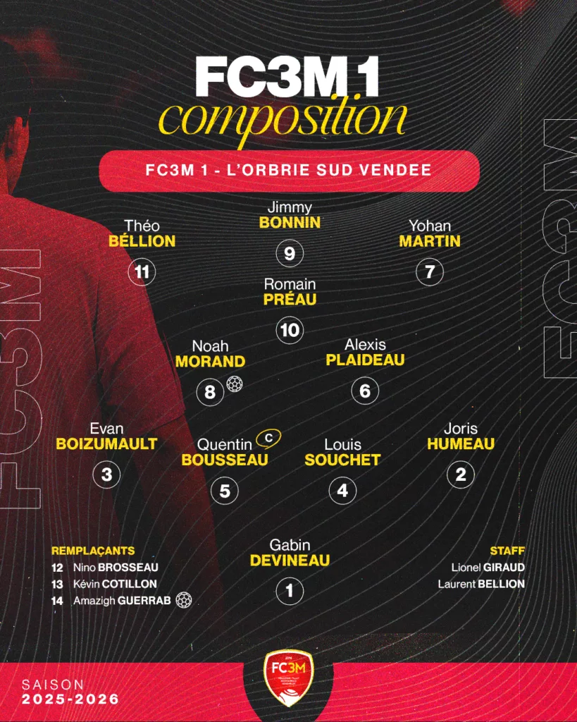 Match capital pour le maintien ce dimanche à La Meilleraie, où les rouges du FC3M recevaient l’Entente Sud Vendée. Et il ne fallait surtout pas arriver en retard : dès les premières secondes, Gabin se fait contrer sur sa relance, mais récupère heureusement le ballon sans conséquence.