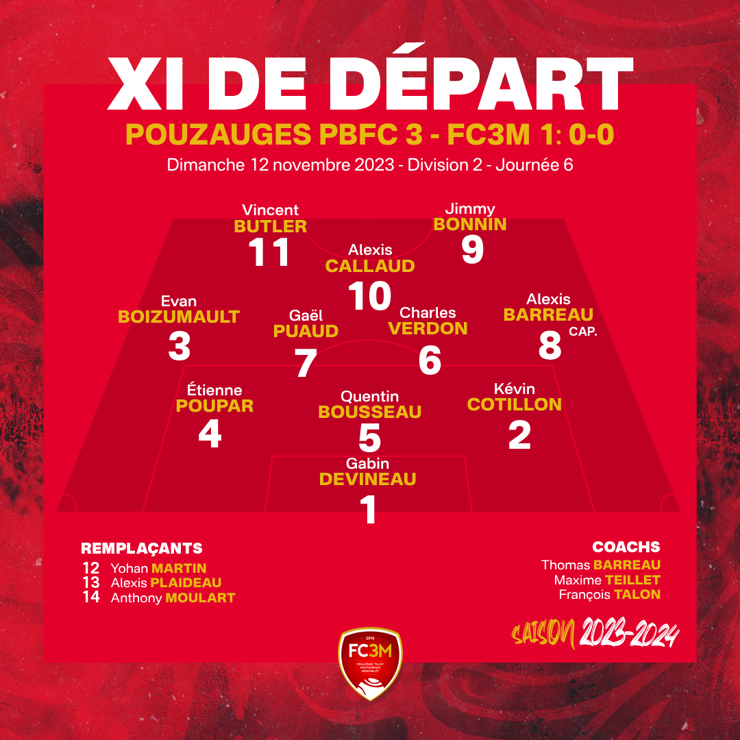 L’entame de match est équilibrée, mais ce sont les locaux qui se montrent rapidement menaçants mais Gabin Devineau réalise deux interventions importantes pour garder sa cage inviolée. Petit à petit, les rouges prennent l’ascendant physique au milieu de terrain et arrivent à se projeter vers l’avant sans toutefois parvenir à inquiéter le portier adverse. En fin de mi-temps, Vincent Butler est lancé sur son aile gauche, frappe au dessus mais l’arbitre accorde un penalty au FC3M pour une faute peu évidente sur la fin de l’action. La tentative de Jimmy Bonnin est stoppée par le gardien du PBFC et la pause est sifflée sur ce score de 0-0.