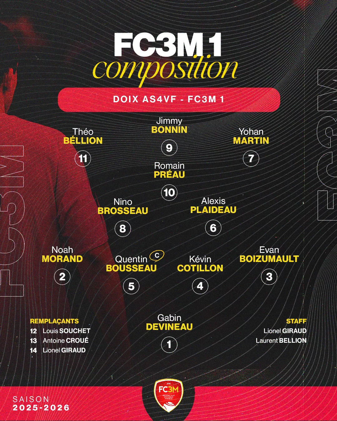 Déplacement à Doix pour les rouges du FC3M avec l’envie de confirmer la bonne dynamique du week-end précédent. Mais le décor est vite planté : une pelouse digne d’un champ de patates, sûrement retournée quelques jours avant, qui complique sérieusement la tâche.