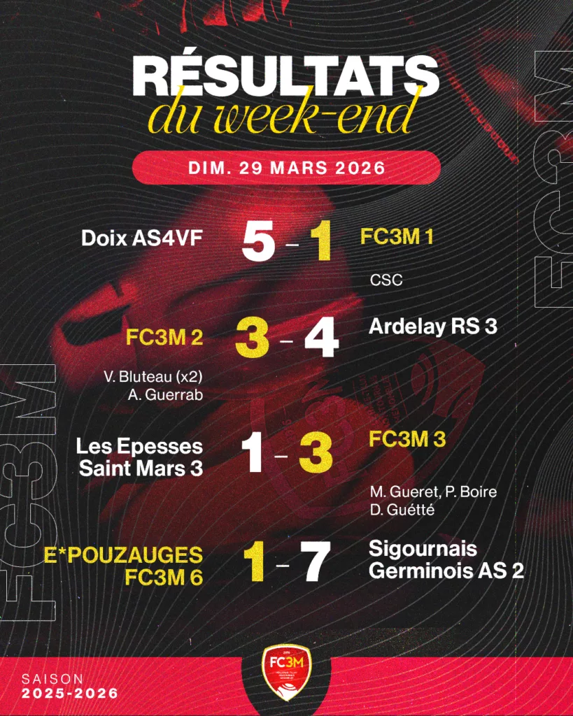L’équipe première perd 1-5 face à Doix AS4VF, l’équipe réserve perd 3-4 face à Ardelay RS 3, L’équipe 3 gagne 3-1 face au Epesses Saint Mars 3, L’équipe 4 perd 1-7 face à Sigournais Germinois AS 2.