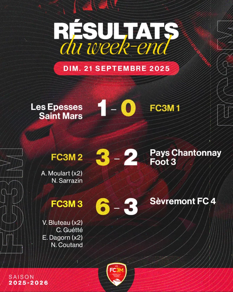L’équipe première perd dans ce 2ème match de championnat 1-0 face au Epesses Saint Mars. La réserve s’impose 3-2 contre Chantonnay 3 et l’équipe 3 gagne 6-2 pour sa première journée de championnat face à Sèvremont FC 4
