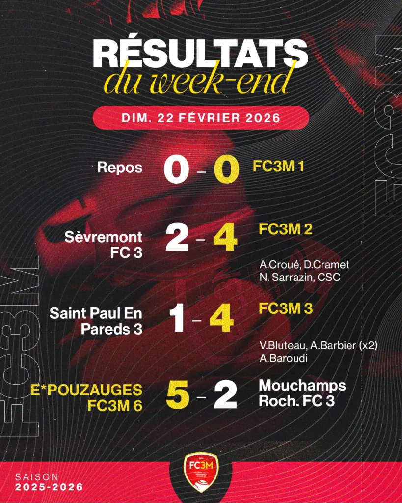 L’équipe première était au repos, l’équipe réserve gagne 4-2 face à Sèvremont FC 3, l’équipe 3 gagne 4-1 face a Saint Paul En Pareds 3 et l’équipe 4 gagne 5-2 face à Mouchamps Roch. FC 3.